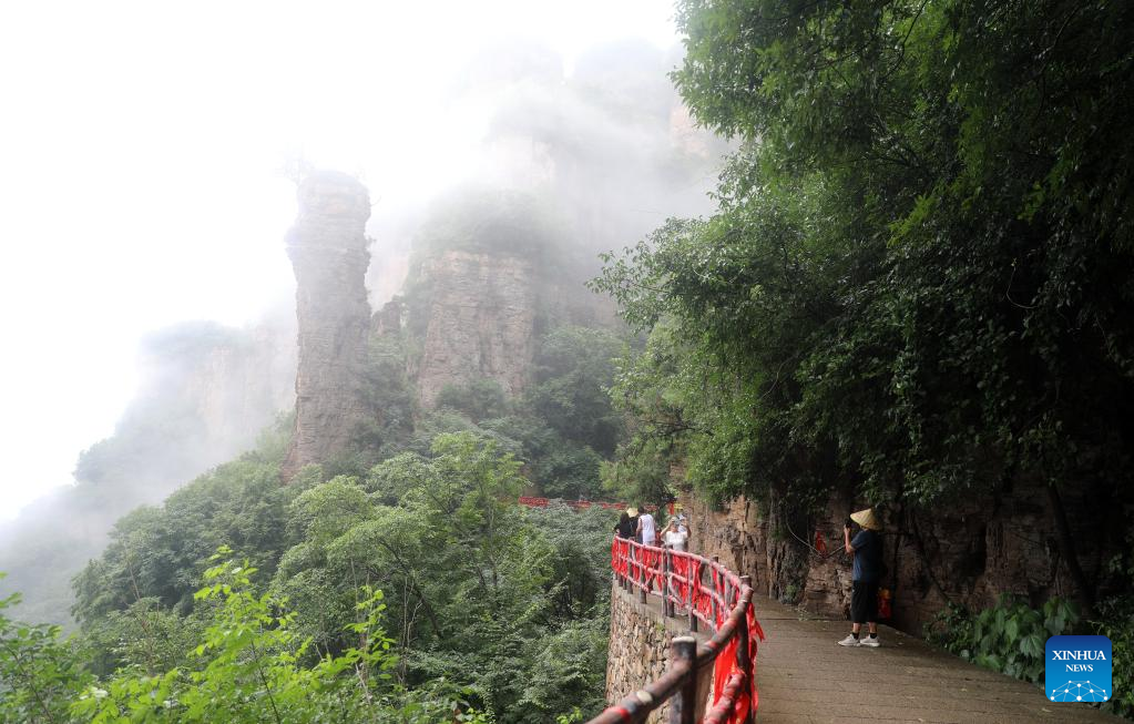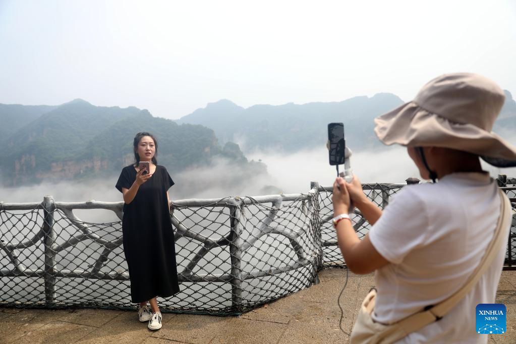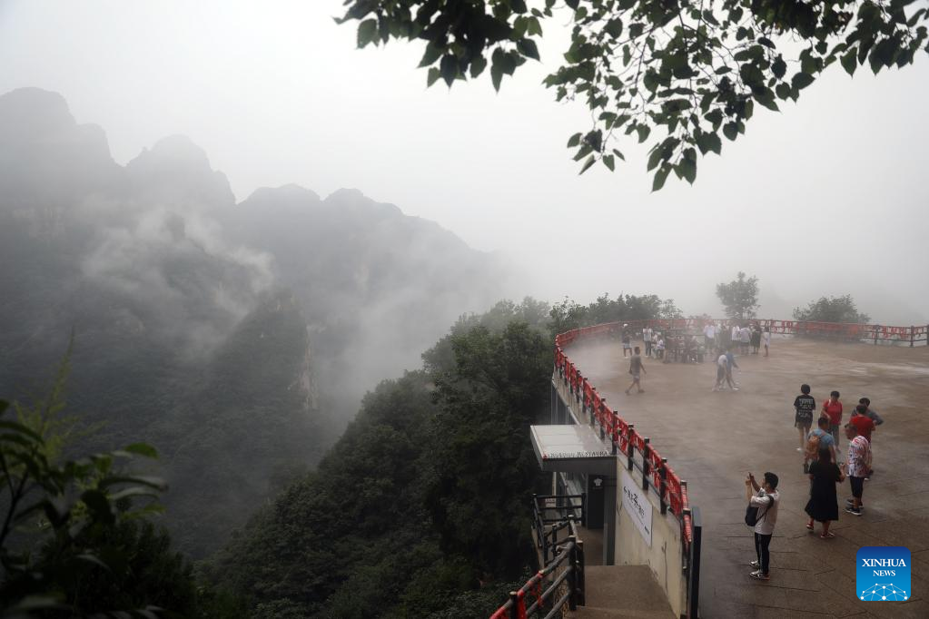 People visit the mist-shrouded Xinglong Mountain in Chengde City, north China's Hebei Province, Aug. 4, 2022. (Xinhua/Luo Xuefeng)