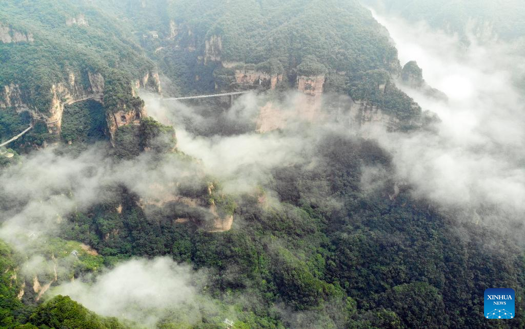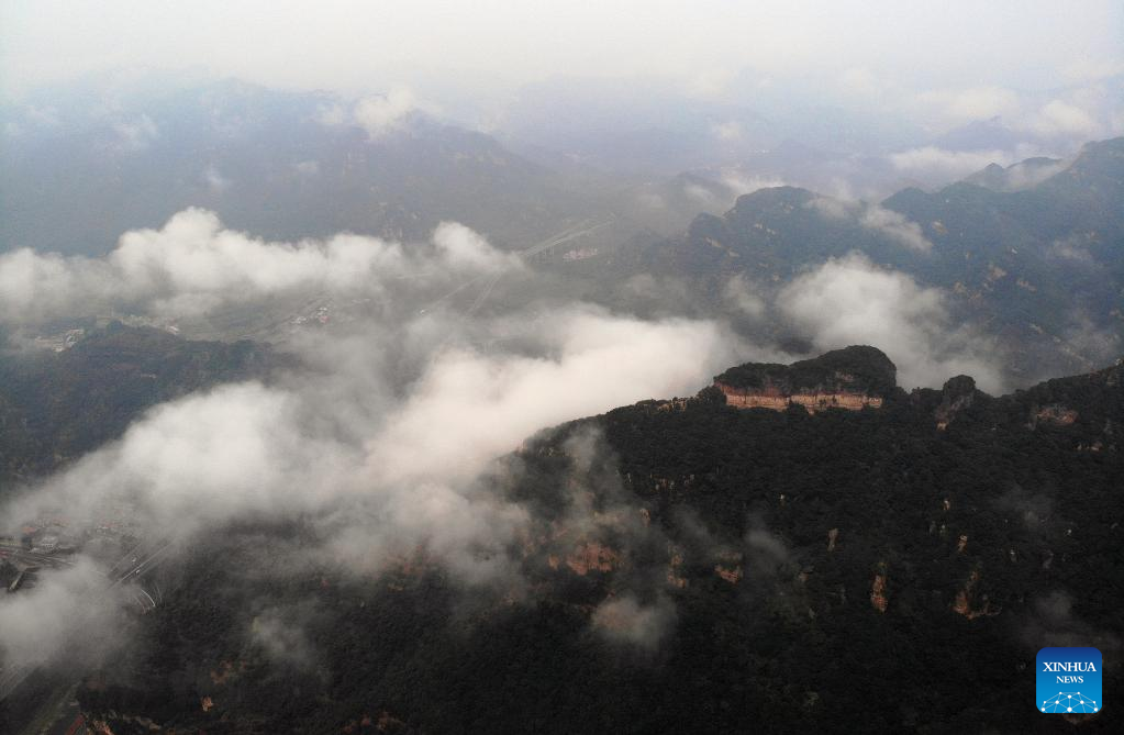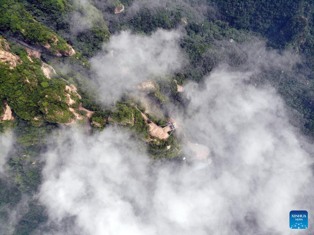 Aerial photo taken on Aug. 4, 2022 shows the mist-shrouded Xinglong Mountain in Chengde City, north China's Hebei Province. (Xinhua/Luo Xuefeng)