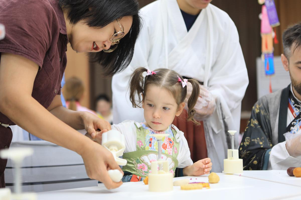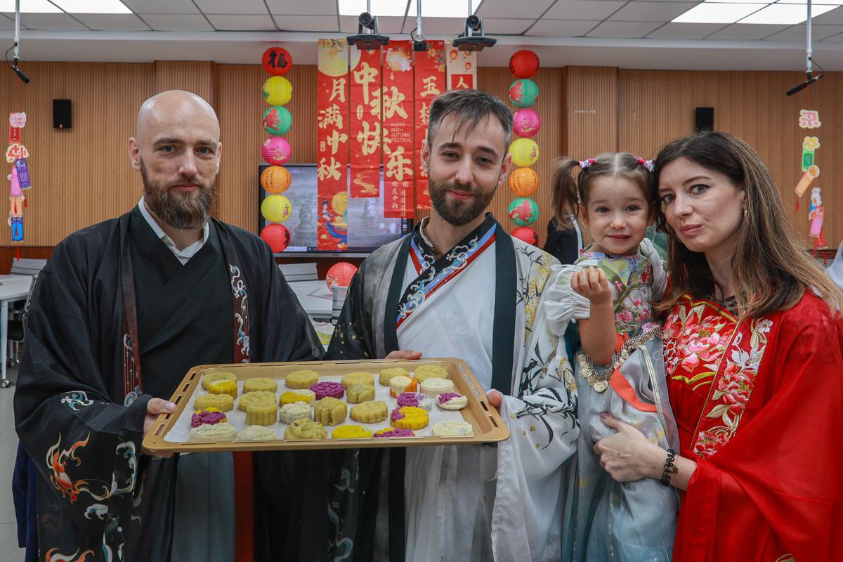 International teachers and a child show mooncakes they made together at Handan University in Handan, Hebei province, on Thursday. [Photo by Li Shen/For chinadaily.com.cn]