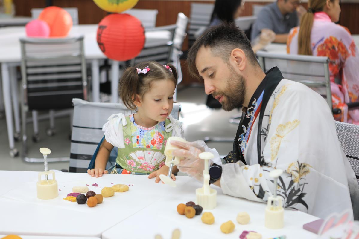 A teacher and his child learn how to make mooncakes at Handan University in Handan, Hebei province, on Thursday. [Photo provided to chinadaily.com.cn]