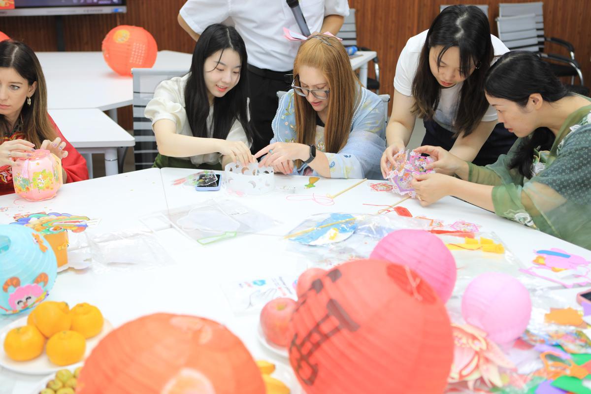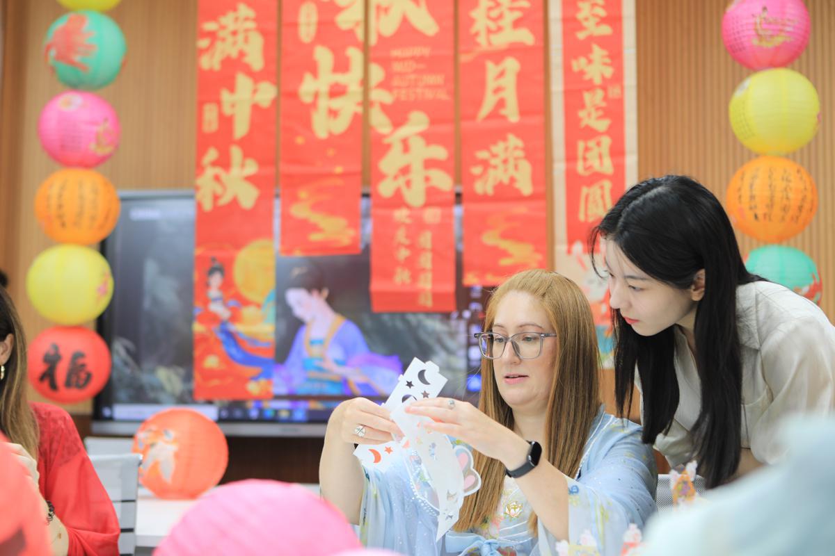 International students and teachers participate in an activity to welcome the Mid-Autumn Festival at Handan University in Handan, Hebei province, on Thursday. [Photo by Li Shen/For chinadaily.com.cn]